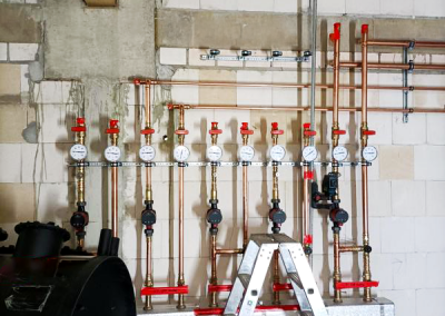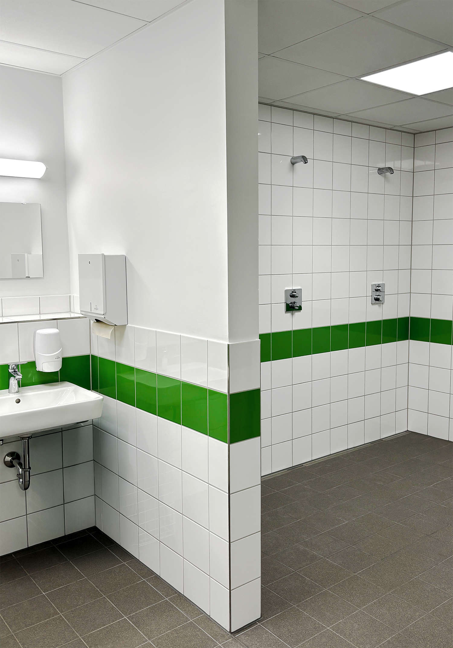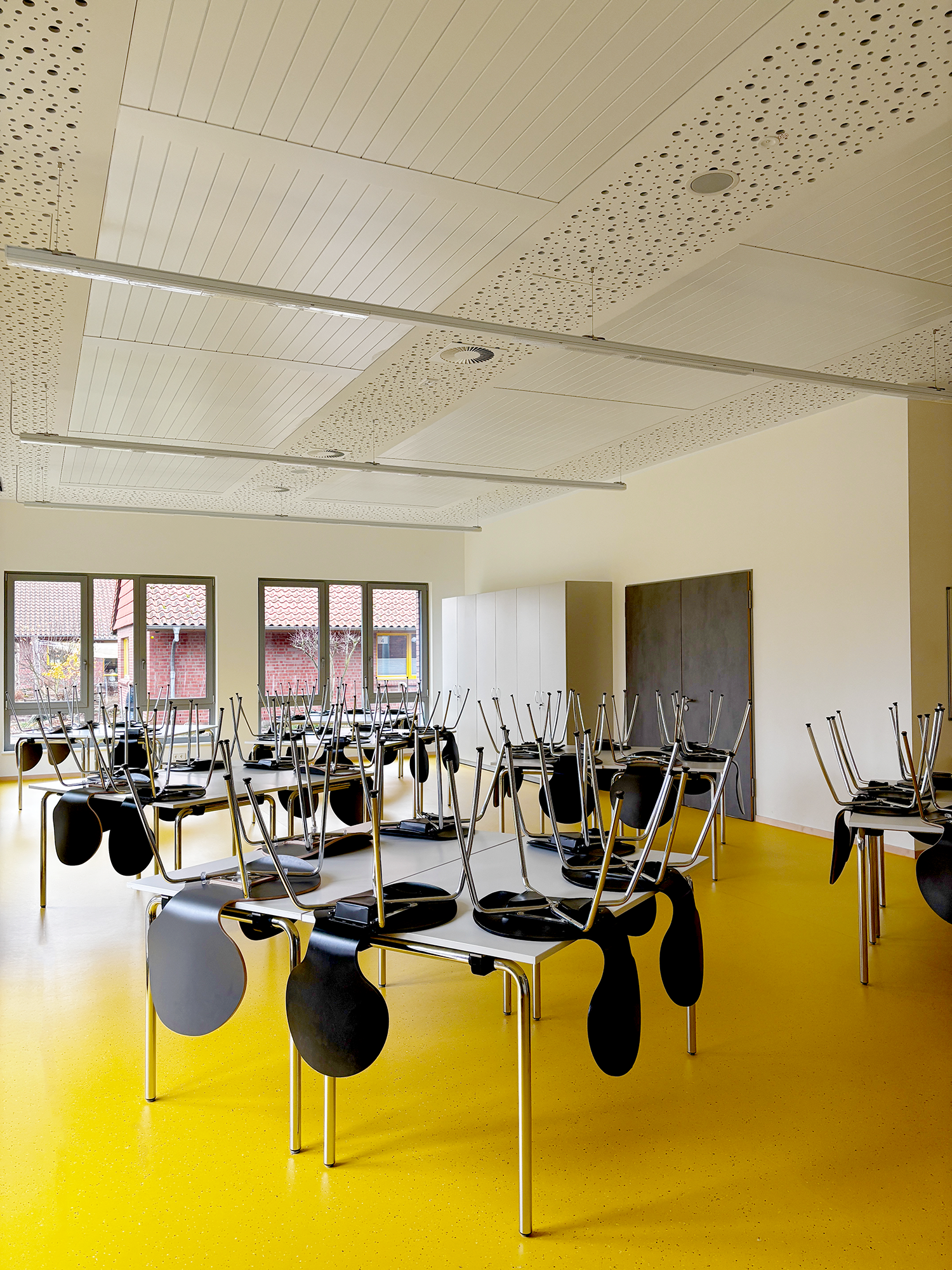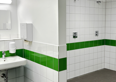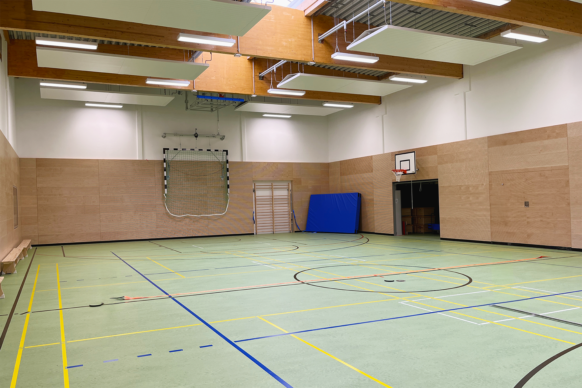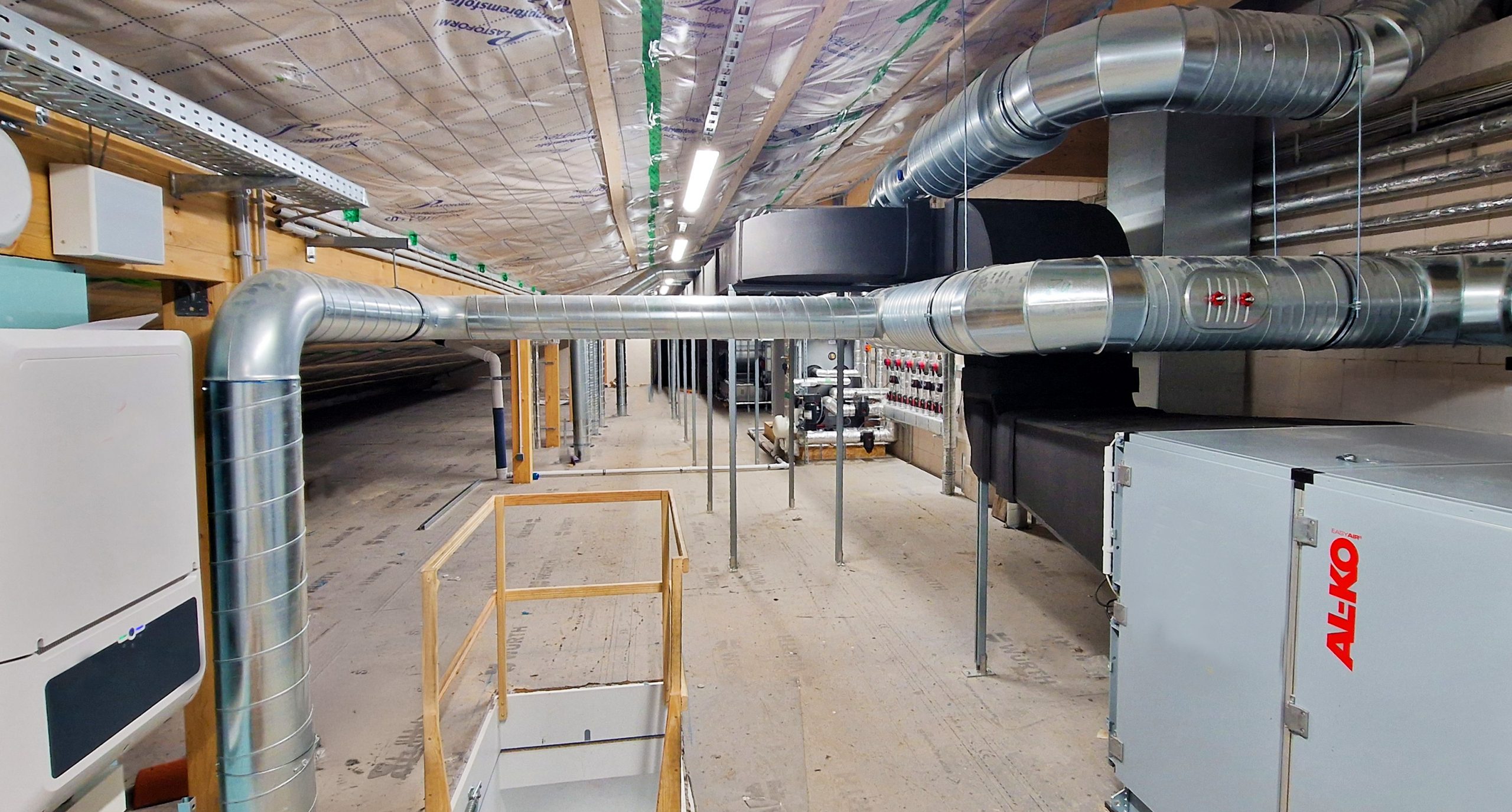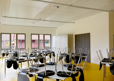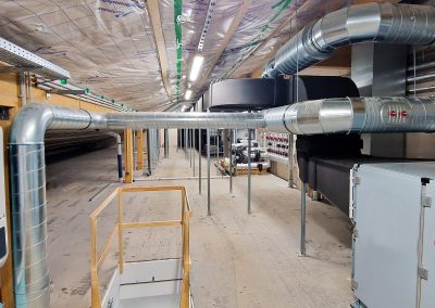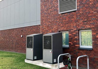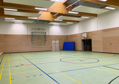 Das PIH-Team war mit der Planung und Ausführung von Sanitär-, Heizungs- und Lüftungstechnik am Projekt beteiligt. Vor dem Gebäude befinden sich zwei Luft-Wasser-Wärmepumpen zur Versorgung des Neubaus. Diese werden mittels eine PV-Anlage angetrieben. Im Gebäude versorgen Deckenstrahlplatten, ein wassergeführtes Heizsystem, die Turnhalle sowie den Mensabereich mit Wärme. Im Sanitärtrakt wird Wärme per Fußbodenheizungen zugeführt. Zwei Lüftungsanlagen sorgen in Mensa und Sporthalle für einen kontinuierlichen Luftaustausch von verbrauchter und frischer Luft.